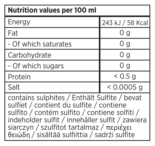 De wijnen van PURE The Winery bevatten minimaal 30% minder calorieën ten opzichte van wijnen die ≥ 12% alcohol, koolhydraten en suiker bevatten. De wijnen van PURE The Winery bevatten 10.5% alcohol, 0 gram koolhydraten en 0 gram suiker.